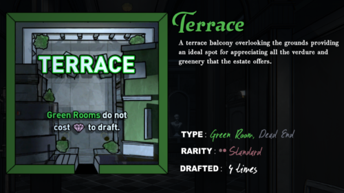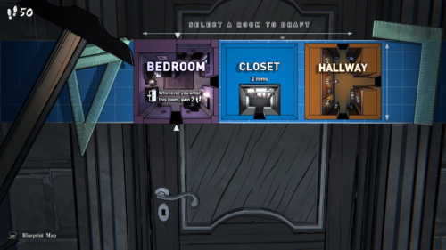 探索する邸宅はとても不思議な邸宅で、なんと間取りが定まっておらず、しかも毎日変化するのです。探索はエントランスホールからスタートしますが、そこにある扉を開けるとランダムに選出された3つの間取りの候補が提示されます。その中から一つの間取りを選択することで初めて、その扉の先の間取りが決定されるのです。この様に扉を通る度に間取りを選択しながら邸宅の中を探索していくことになります。それぞれの間取りは扉の数や位置が異なっていたり、様々な効果が得られたりと多種多様。状況に応じて適切な間取りを選択するのがゲームのカギとなります。