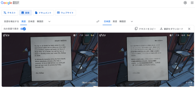本作をプレイするにあたって英文を読むことは避けられず、英語が苦手な人にとっては大きな障壁だと思います。私も短い文ぐらいなら頑張れますが、本作には長文の文書も多数登場するので大変でした。そこで活用したのがGoogle翻訳です。私はゲーム中に気になったものはとにかくスクリーンショットで保存し、その画像をGoogle翻訳で日本語に変換するようにしました。もちろん所々おかしな翻訳になっている部分もありますが、大まかな内容が理解できるだけでも役立ちます。また筆記体を認識して翻訳してくれるのもありがたいですね。