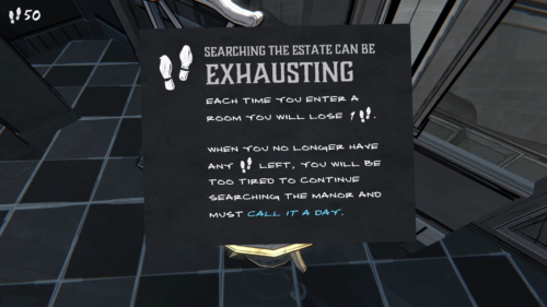 隠された46番目の部屋を探す旅はとうてい一日で終えられるものではなく、何日もかけて探索に挑む必要があります。探索には体力を要し、部屋に入る度に画面左上に表示されている足跡マーク(体力)が1つ減り、体力がゼロになるとその日の探索は終了しなければなりません。