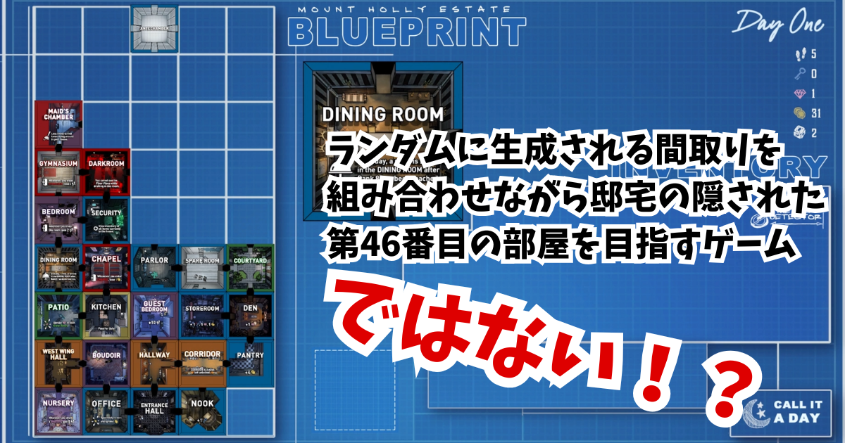 探索する邸宅はとても不思議な邸宅で、なんと間取りが定まっておらず、しかも毎日変化するのです。探索はエントランスホールからスタートしますが、そこにある扉を開けるとランダムに選出された3つの間取りの候補が提示されます。その中から一つの間取りを選択することで初めて、その扉の先の間取りが決定されるのです。この様に扉を通る度に間取りを選択しながら邸宅の中を探索していくことになります。それぞれの間取りは扉の数や位置が異なっていたり、様々な効果が得られたりと多種多様。状況に応じて適切な間取りを選択するのがゲームのカギとなります。