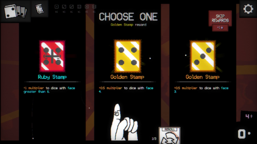 もう一つのパッシブ効果としてスタンプによる出目の強化があります。たとえば「3の目が出たダイスの倍率を+0.5する」といった具合に特定の目を強化することが可能です。自分の持っているダイスがどんな目を持っているか、どの目を強くしたいのかを考えて強化していきます。本作においてはもはや出目の数字が大きければ強いという訳ではありません。ビルドによっては1を出すのが最強という事もあるのです。