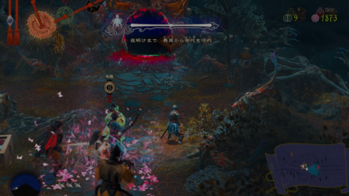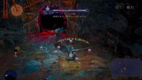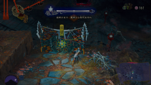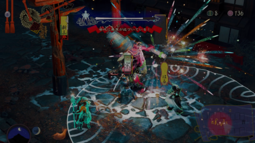 夜になると敵との戦いの始まりです。世代は歩みを止め、鳥居からは敵が湧き出てきます。勝利条件は夜明けまで世代を守り抜くこと、敗北条件は世代の体力が尽きてしまうことです。なおプレイヤーが操る宗は体力がなくなると霊魂状態になって戦いに参加できなくなりますが、ゲームオーバーにはならず暫くすると復活できます。