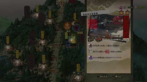 穢れから解放した村は拠点として利用可能になり、拠点では宗や村人の強化やカスタマイズをすることができます。