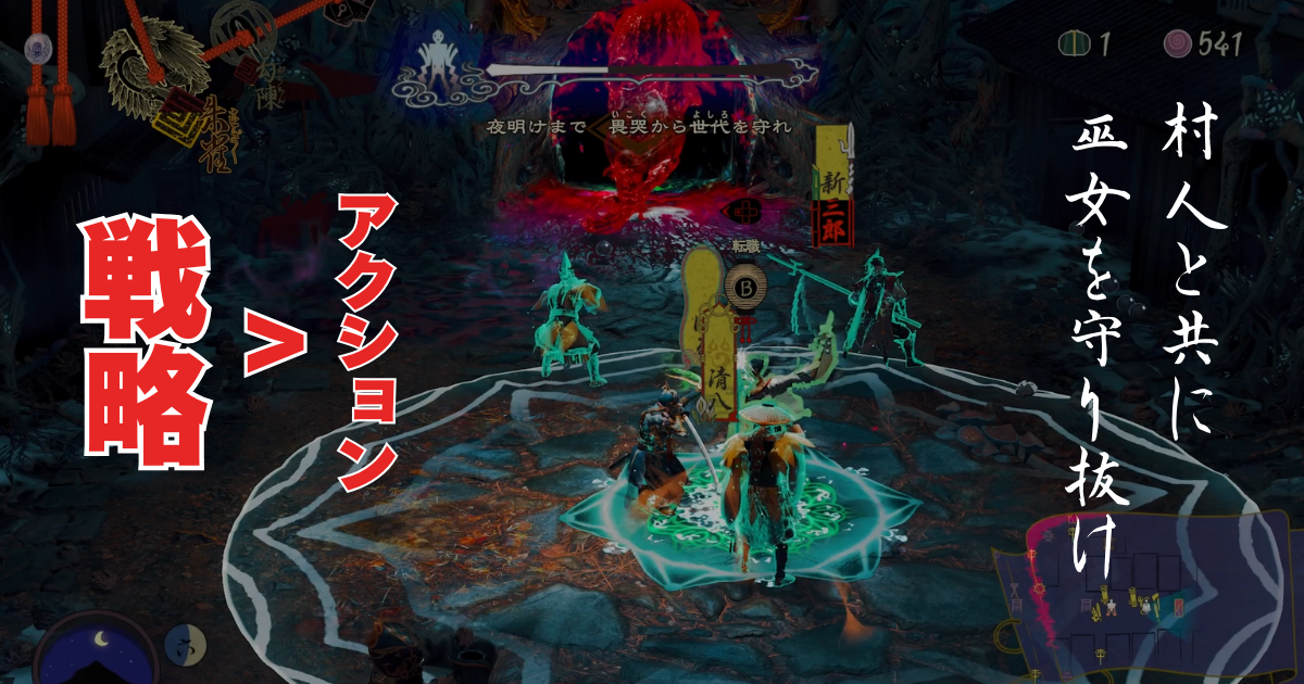 ゲームは各村が1つのステージとなっているステージクリア型の作りになっています。各ステージの最奥には穢れた鳥居があり、鳥居まで世代を導き浄化するとステージクリアです。しかし鳥居に到達するのには時間が掛かり、いずれ夜を迎えることになります。夜になると敵(畏哭いこく)が現れ世代を襲ってくるため、夜明けまで世代を守らなければなりません。プレイヤーは宗を直接操作して戦いつつも、村人に指示を出して共に戦うというタワーディフェンスとアクションが組み合わさったゲームになっています。