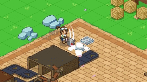 では早速ハンマーを使って古い設備を解体していきましょう。設備を解体すると部品に変化し、触れると回収することができます。10個解体すれば目標達成ですが、ついでなので周辺の古い設備を全て解体しておくと良いでしょう。解体が済んだらおばさんに話しかけましょう。