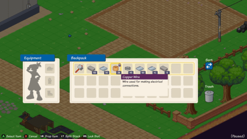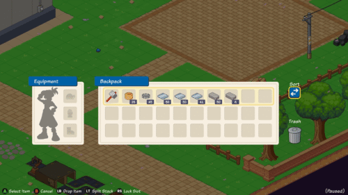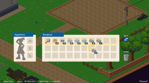 インベントリのスロットが満杯で新たにアイテムを拾えない時、インベントリ内のアイテムを一旦手放してスロットを開ける必要があります。手放したいアイテムを選択してLBを押すことでそのアイテムを床地面に置くことができます。