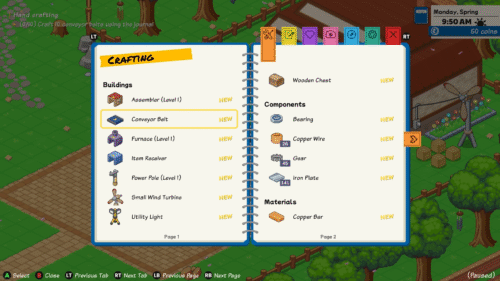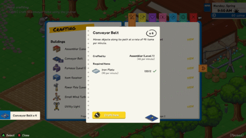 アイテム一覧からコンベアベルトを選択すると上図のような画面が表示されます。ここにはコンベアベルトを作製するのに必要な材料などが記されています。コンベアベルトを1つ作製するためには鉄板(Iron Plate)が2つ必要です。鉄板は先程分解した設備から入手できているので、Aボタンを長押しすることで作製できます。更にAボタンを押し続けることで連続して作製することもできます。10個作製したらおばさんに話しかけましょう。