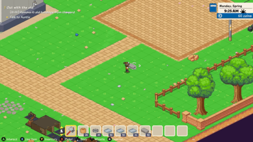 ここからチュートリアルとしておばさんの指示に従っていきます。まずは庭の古びた設備をハンマーで叩いて解体していきましょう。ここでの目標は古びた設備を10個解体することです。