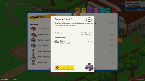 鉱石を精錬するためには炉(Furnace)が必要です。ジャーナルを開いて炉を作製し、設置してみましょう。作製・設置の仕方は前回のコンベアベルトと同じです。