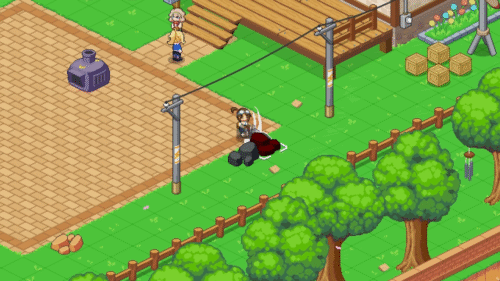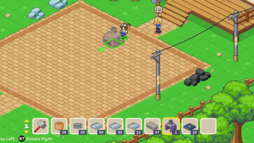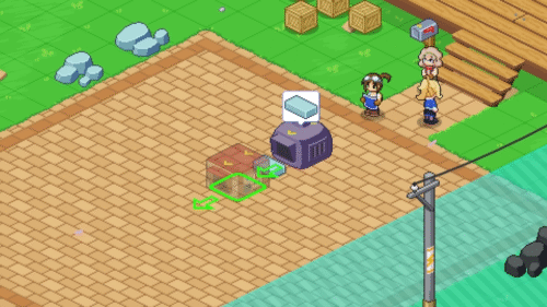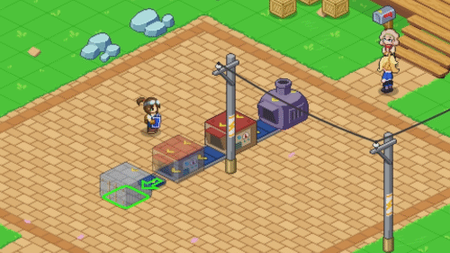 次に各設備をコンベアベルトで連結します。各設備の間にコンベアベルトを設置してつなげると、前の設備で製造されたものが自動的に次の設備に入っていきます。ここまでできたらおばさんに話しかけましょう。