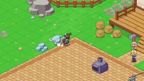 最後に採取した原料を炉に投入します。クイックバーで投入する原料にカーソルを合わせてXボタンを押すと炉に投入できます。鉄鉱石と石炭を炉に10個投入しましょう。無事に鉄棒が製造できたらおばさんに話しかけましょう。