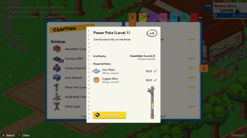まずはジャーナルを開いて電柱を作製しましょう。そしてクイックバーで電柱を選択しXボタンを押して設置モードにすると、黄色のエリアと水色のエリアが表示されます。黄色のエリアはその電柱が電力を供給できる範囲を示しています。水色のエリアは既に電力が供給されている範囲を示しています。新たに設置する電柱が既設の電柱から遠すぎると電線が届きませんので、電線が届く範囲に電柱を設置しましょう。