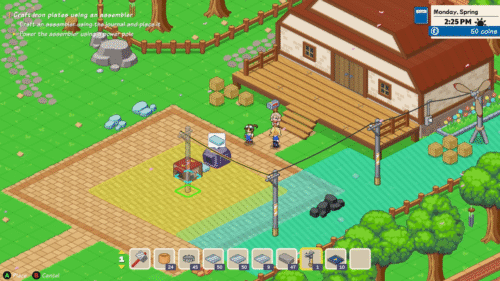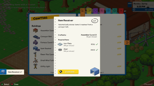 作製したレシーバをコンベアベルトを製造している組立機の先に設置し、その間にコンベアベルトを設置し連結しましょう。すると製造されたアイテムは自動的にレシーバに入り貯蔵されるようになります。レシーバにコンベアベルトを10個回収できたらおばさんに話しかけましょう。