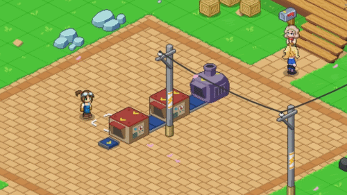 組立機に電力が供給出来たら、炉で製造された鉄棒を組立機に投入してみましょう。すると鉄板が製造されて組立機から出てきます。ここまでできたらおばさんに話しかけましょう。
