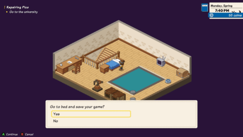 自室のベッドで寝るとセーブすることができます。またクエストの関係などで翌朝まで時間を進めたい時にも利用すると良いでしょう。