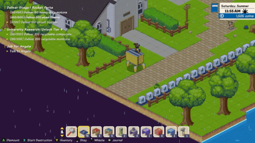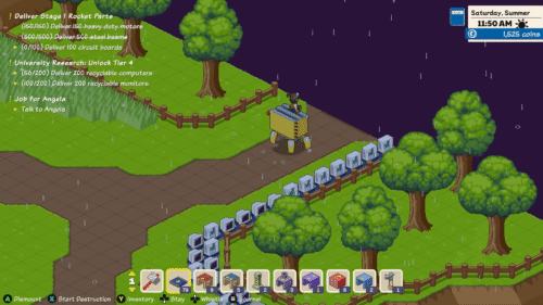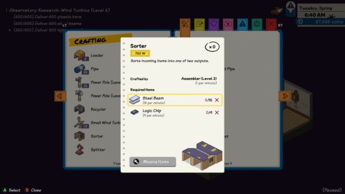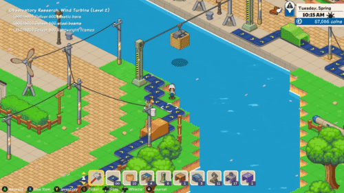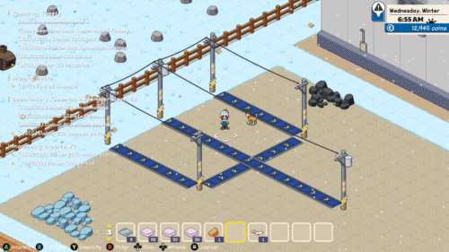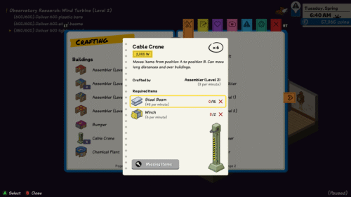 ケーブルクレーン(Cable Crane)2本の柱をケーブルで繋ぎ、その間でのモノの輸送を行う設備です。例えば川をまたいで柱を設置すれば、川の上を経由してモノを輸送させることができます。本設備が特に必要となる場面として、ゲームを進めると船でジャンク品のコンピュータやモニターを輸入することができるようになるのですが、この船から荷物を引き揚げる際にケーブルクレーンが必要になります