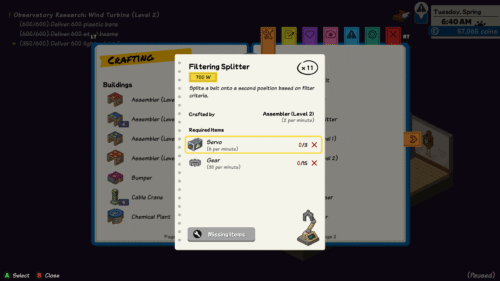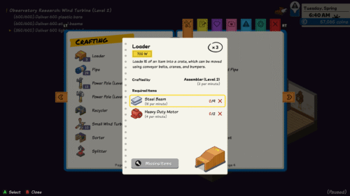 ローダー(Loader)複数のアイテムを一つの木箱に詰め込む設備で、アンローダー(Unloader)木箱をバラシて一つずつに戻す設備です。これが役立つのはケーブルクレーンでアイテムを輸送する時です。ケーブルクレーンは1回の動作に時間が掛かるので、コンベアよりも輸送効率は悪いです。そこで木箱にまとめてからケーブルクレーンで輸送することにより効率アップできます。
