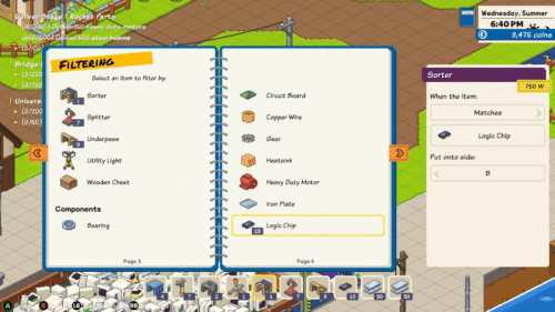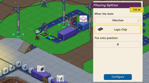 分別機(Sorter)投入されたアイテムを分別して排出先を振り分けることができます。例えば上で説明したようにジャンクコンピュータをリサイクルするとロジックチップとプラスチックくずが出てきますが、このままだとコンベア上に異なるアイテムが混在して都合が悪いです。そこで分別機を通すことでそれぞれ異なるコンベアに分けて整理することができます。