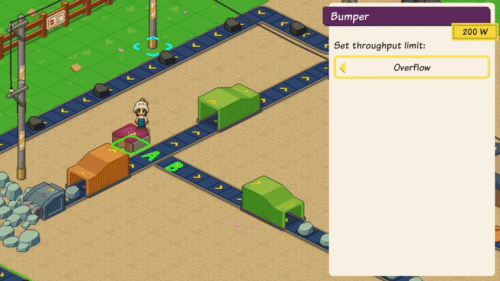 バンパー(Bumper)を使用することでコンベア上の木箱を別のコンベアへ移動させることができます。木箱の場合はスプリッターではなくバンパーを使わなければならないという事です。使い方は基本的にスプリッターと同様で、A地点からB地点へ移動させる頻度を指定します。