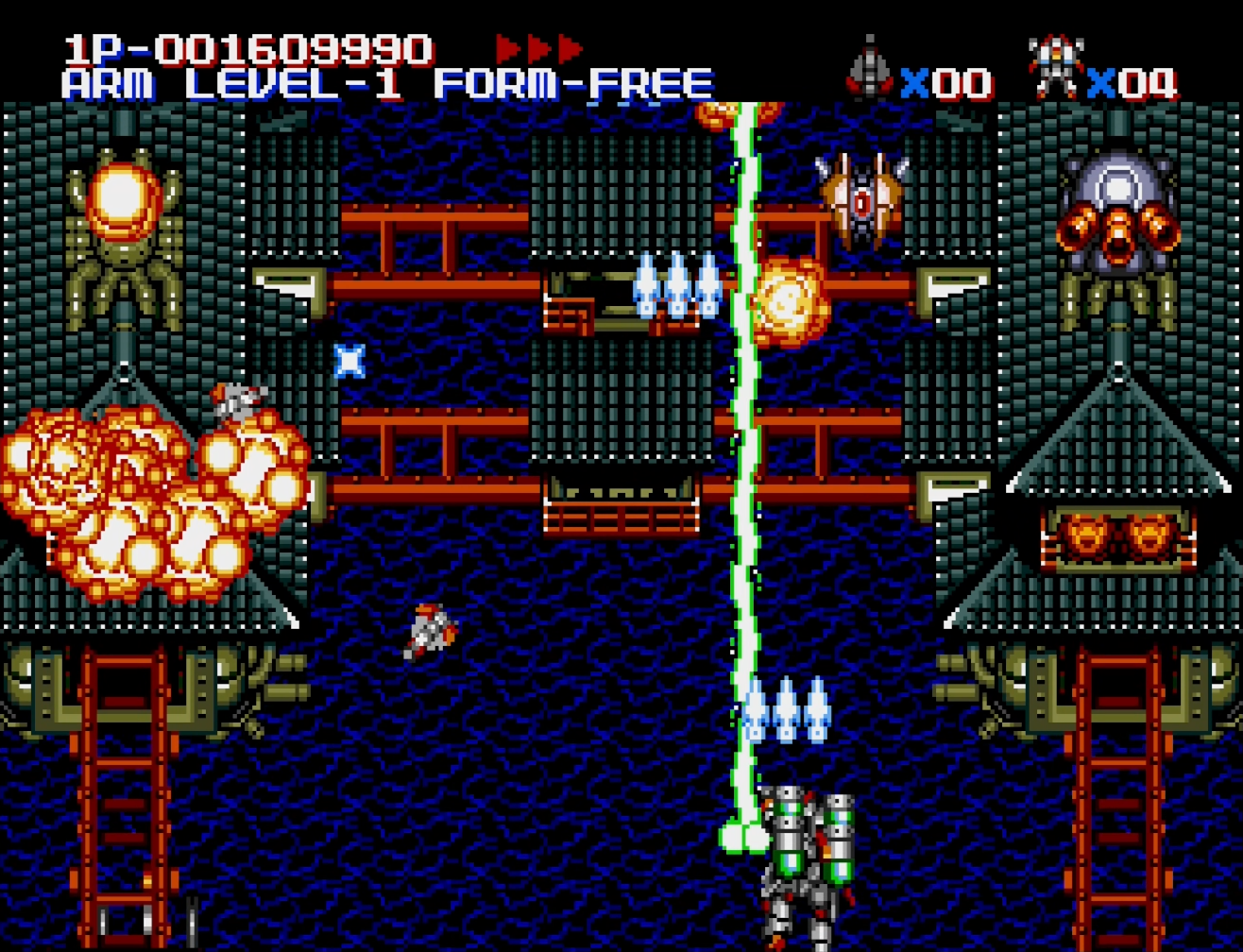 『武者アレスタ』は鎧武者姿のロボット「アレスタ」に搭乗して戦う縦型シューティングゲーム。通常攻撃の他に、アイテムを取ることで使用できる3種のサブウェポンがあったり、オプション機のフォーメーションを切り替えられたりと、自由度の高い戦い方ができるのが特徴的です。