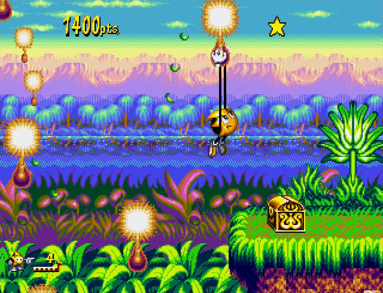 『リスター・ザ・シューティングスター』は、流れ星から生まれたヒーロー「リスター」となって、バジル星系を救うため貪欲王グリーディーと戦う横スクロールアクションです。腕を伸ばして様々なものを掴んでおこなうアクションが特徴的で、敵を掴んで投げたり、ステージ内のモノを掴んで移動に使ったりすることができます。