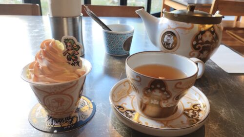 今回、絶対に食べたかったコラボメニューがアリタポーセリンラボ有田旗艦店Cafeで提供されているサラの有田焼パフェです。このパフェの器は持って帰ることができるので旅の記念にもなります。味の方はというと見た目からは分かりませんがてっぺんのクリームの下にショコラが隠れていてこれが濃厚で美味しいんです。そして見た感じ小ぶりなパフェですがショコラがぎっしり詰まっているので想像以上に食べ応えがありました。一緒に注文したうれしの和紅茶の茶器が偶然にもサラの色に合っていて良い感じです。
