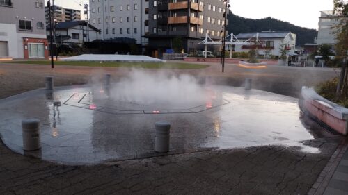 この日の宿泊施設も前日と同じくセントラルホテル。こちらも武雄温泉駅の目の前にあり最高の立地です。写真は武雄駅前広場の噴水で、その奥に見える黒っぽい建物がセントラルホテルです。もちろんロマ佐賀連携宿泊施設ですし、併設の泉都乃湯はSaGa風呂通の対象になっています。