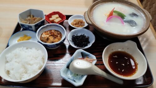 夕食には嬉野温泉名物の温泉湯豆腐を頂きました。普通の湯豆腐というと透明の昆布だしで豆腐を煮ていますが、温泉湯豆腐は出汁が白濁しています。これは温泉水で煮ることで豆腐がとろけて出汁が白濁するのだそう。出汁自体にも味が付いているし、色んな具も入っていてイメージとしては豆腐メインのお鍋という感じ。