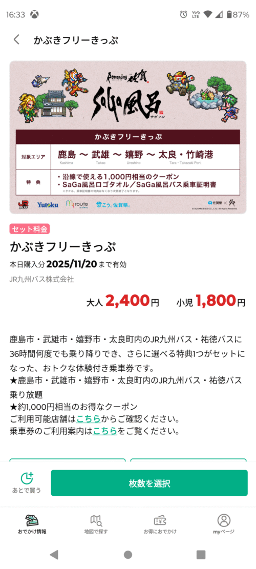 この後の祐徳稲荷神社および嬉野温泉への移動にはバスを利用します。そこで是非利用したいのが「かぶきフリーきっぷ」です。これは対象エリアのバスが36時間乗り放題になるフリーパスで、特典として沿線店舗で使える1000円引きクーポンも付いてきます。さらに2025年12月31日まではSaGa風呂ロゴタオルと乗車証明書も貰えるのでサガファンとして使わない手はありません。