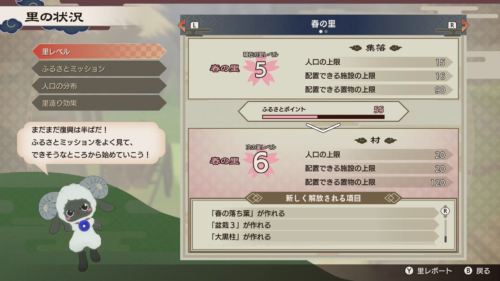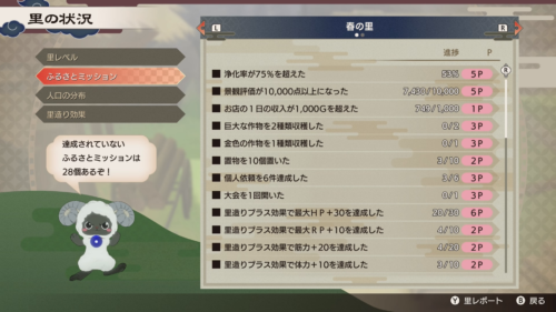 里には里レベルというものがあり、里レベルが上がると人口が増えたり、新たな建物が建てられるようになったりといったメリットがあります。里レベルを上げるためにはふるさとミッションを達成してふるさとポイントを溜める必要があります。ふるさとミッションの内容は、農作物を一定数収穫することや、建物を建てることなど多種多様です。自然にプレイしているだけでどんどんミッションを達成できますが、たまにはミッションの内容を確認して方針を考えると良いかもしれません。