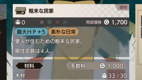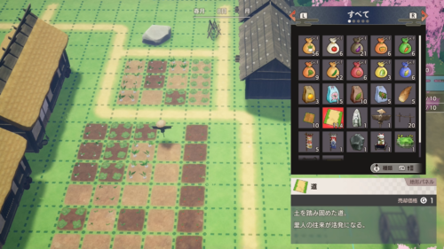 里に設置できる建物や置物は設置することで様々な恩恵を得ることができます。例えば、かかしを設置すると農業の効率がアップするので里の収入源アップに繋がります。他にも民家を建てるとHPがアップというような主人公のステータスアップに寄与するものまであり、その効果は多種多様です。里が繁栄すれば収入も増え、主人公の成長にも繋がり一石二鳥というのが本作の特徴的なシステムですね。