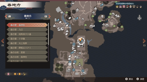 ゲーム中、様々な里や浮島を頻繁に行き来することになります。そこで便利なのがファストトラベルです。本作は基本的にいつでもどこでもファストトラベルをすることができ、しかもファストトラベルの目的地もかなり細かく数多く設けられているので、快適に移動することができます。