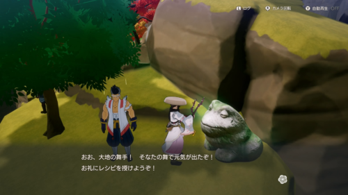 本作は至る所に寄り道ポイントが設けられています。カエル石や祠を調べるとレシピを授けてくれるのですが、こういったものがあちこちに存在しています。メインストーリーを進める合間の隙間時間にフィールドを探索するのも楽しみの一つです。