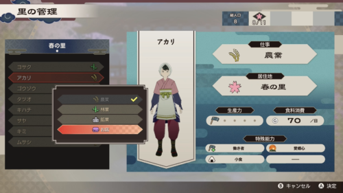 里を復興させるには農業や林業、お店といった産業によって収入を確保する必要があります。それらの仕事を里の住人に割り振って働いてもらうことができます。ただし住人にはそれぞれ得意なこと、苦手なことがあるので、特性を考慮して適切に仕事を割り振ることが大切です。なお、里の復興が進んでくると里の住人も増えてくるので、できることが増えると同時に住人の管理の重要度も増してきます。