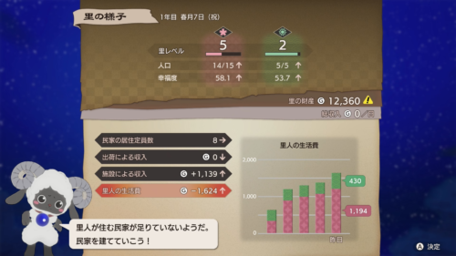 一日の終わりに里山レポートで里の状況を確認することが可能です。収入に対して支出が大きすぎないか、住人に対して住居の数が不足していないかを確認しましょう。モコロンがワンポイントアドバイスをしてくれるので参考にすると良いでしょう。