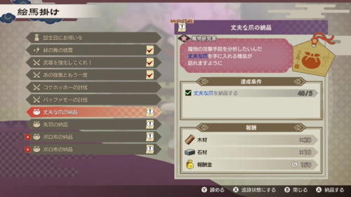 里にある絵馬掛けで住人からの依頼を確認することができます。依頼の内容は指定されたアイテムの納品や魔物の討伐などがあり、達成すると報酬としてお金やアイテムが手に入ります。また依頼の達成はふるさとポイントの獲得にもなるので、里長として積極的に依頼をこなすことが大切です。