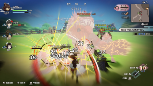 里の外に冒険に出る際には仲間とパーティを組むことが可能です。仲間にはそれぞれタイプが設定されており、攻撃、防御、回復、支援、妨害といったタイプに分かれています。また各キャラクターで使用する武器や得意な属性も異なるので、行き先に応じてどんなパーティで挑むのか考えるのも楽しいです。
