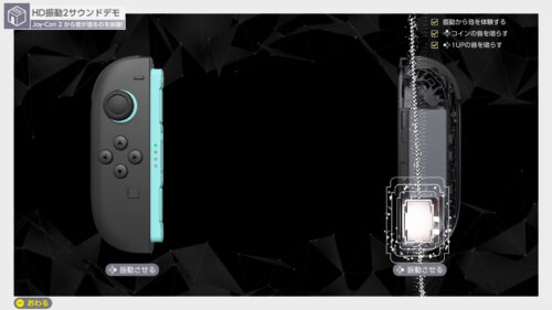 Joy-Con 2に搭載されているHD振動2ではSwithのHD振動よりも更に精細な振動が可能になっています。そしてHD振動2を使うことでJoy-Con 2自身から音を奏でることができるのです。確かに物体を振動させれば音が鳴り、振動を制御すれば音色をコントロールできるという理屈は理解できます。しかしそのクオリティが私の想像を遥かに超えていました。本作のテックデモではマリオでおなじみのコインを取った音や、1upした音をHD振動2を使ってJoy-Con 2で鳴らすことができるのですが、非常にクリアなサウンドでJoy-Con 2にスピーカーが付いているのかと思うぐらいでした。