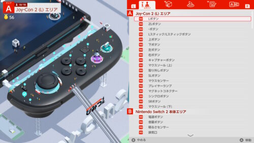 ひみつ展という名前の通り、本作は展示会を見て回るというスタイルで構成されています。そして会場はSwitch 2の本体や周辺機器をモデルにした形になっています。Switch 2を構成する各パーツ(ボタン、端子など)にはスタンプが設置されており、スタンプを集めて回ることで自然とSwitch 2の構造を理解することが可能です。